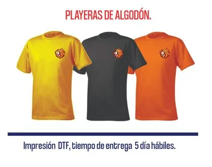 Playeras de algodón con logo o imagen impresa (impresión DTF) a color, tallas S, M, L, XL, colores amarillo, celeste, azul, blanca, gris.