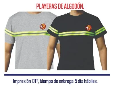 Playeras de algodón con logo o imagen impresa (impresión DTF) a color, con franjas de seguridad, tallas S, M, L, XL, colores negro y gris.